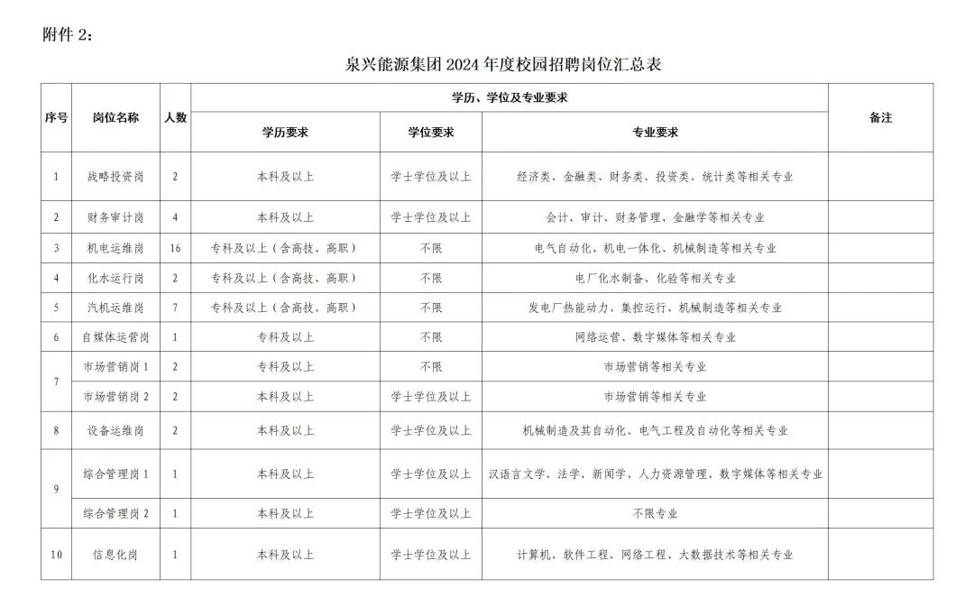 山東泉興能源集團有限公司為棗莊市直國有大型企業(yè),擁有建材、煤電、新興產(chǎn)業(yè)、現(xiàn)代服務業(yè)四大板塊,下轄二、三級公司22家,已形成集資源開發(fā)、建材加工、熱電聯(lián)產(chǎn)、智能制造、金屬圍護、現(xiàn)代物流、城市服務、金融投資等多位一體、適度多元的綜合經(jīng)營格局。企業(yè)資產(chǎn)總額110億元,員工5000余名。集團先后榮獲“全國五一勞動獎狀”“富民興魯勞動獎狀”“山東省文明單位”“山東省優(yōu)秀企業(yè)”“山東社會責任企業(yè)”“棗莊市功勛企業(yè)”等榮譽數(shù)百項。根據(jù)集團業(yè)務發(fā)展需要,現(xiàn)進行人員公開招聘,有關事項公告如下:(三)認同山東泉興能源集團有限公司企業(yè)文化,品行端正,愛崗敬業(yè),團結奮進;(四)具備符合崗位要求的專業(yè)知識和工作能力;(五)具有良好的心理素質和正常履行職責的身體條件;(六)年齡在18周歲以上、35周歲以下,符合相關崗位要求的任職資格條件,年齡和工作年限的計算截至2024年12月31日;(七)校園招聘對象為2022、2023、2024年高校畢業(yè)生(兩年擇業(yè)期內(nèi)未落實工作單位的高校畢業(yè)生,不含各類委培生、定向生)。應聘人員報到入職時必須取得教育部承認的學歷、學位證書,海外留學歸國人員還應取得教育部留學服務中心出具的學歷學位認證證明。在讀非應屆畢業(yè)生,不得應聘。在讀全日制普通高校非應屆畢業(yè)生不能用已取得的學歷學位作為條件應聘。因犯罪受過刑事處罰的人員,被開除中國共產(chǎn)黨黨籍的人員,被開除公職的人員,正在接受審計、紀律審查或涉嫌犯罪、司法程序尚未終結的人員,以及法律法規(guī)規(guī)定不得聘用的其他情形人員不得應聘。本次招聘人數(shù)64人,具體詳見《山東泉興能源集團有限公司社會招聘崗位匯總表》和《山東泉興能源集團有限公司校園招聘崗位匯總表》(見附件)。本次招聘委托第三方人力資源中介機構,按照發(fā)布公告、網(wǎng)上報名、網(wǎng)上審核、筆試、資格審查、面試、考察、檔案審核、體檢、研究確定、公示和錄用等程序開展。其中應聘人員個人總成績按照筆試、面試各占50%的比例合成總成績。報名時間:2024年12月11日9:00—2024年12月19日17:00查詢時間:2024年12月11日11:00—2024年12月22日17:00(二)報名方式:報名采取統(tǒng)一時間、網(wǎng)上報名的方式進行。報名網(wǎng)址:http://47.95.212.0:8088/#/?code=7b7485。應聘人員登錄報名網(wǎng)站,認真閱讀招聘公告,如實填寫、提交相關個人應聘信息資料,且須在報名時上傳照片(一寸近期免冠照片,JPG格式,文件大小不超過20K)、身份證、學歷證、學位證、有效期內(nèi)的學歷證書電子注冊備案表、職稱、職業(yè)資格等崗位要求的相關信息。社會招聘的還需上傳相關工作經(jīng)歷印證材料、任職文件等。應聘人員每人僅限報考1個崗位,未按要求填寫報名材料及1人申報多個崗位者視為無效報名。應聘人員在資格初審前多次登錄填報應聘信息的,后一次填報自動替換前一次填報信息。應聘人員不得惡意注冊報名信息,擾亂報名秩序,應聘人員在應聘期間的表現(xiàn)將作為公開招錄考察的重要內(nèi)容之一。應聘人員報名時應按照規(guī)定流程和時限,盡早完成各環(huán)節(jié)操作,因“壓哨報名”而影響資格初審結果的,后果由應聘人員本人承擔。本次招聘實習期滿,經(jīng)組織考核合格后簽訂正式勞動合同。研究生及“985、211”高校畢業(yè)生,年度薪酬標準不低于8萬元;其他普通院校畢業(yè)生,按照所在公司薪酬管理制度執(zhí)行;繳納社保、公積金。(一)實行回避制度,企業(yè)及子公司領導人員的配偶、子女及其配偶不得應聘所任職企業(yè)及其出資企業(yè)崗位。凡與用人單位領導人員有三代以內(nèi)旁系血親或近姻親關系的應聘人員,不得應聘該企業(yè)人事、財務、監(jiān)督檢查等崗位以及錄用后即構成回避關系的崗位。(二)資格審查貫穿招聘全過程,應聘人員對提供的材料信息的真實性、有效性負完全責任,凡弄虛作假者,一經(jīng)查實,即取消應聘或聘用資格。(三)對考察或檔案審核不合格,以及自動放棄體檢或體檢不合格造成的空缺,根據(jù)工作需要,可從同一崗位應聘人員中按照成績從高到低等額遞補。(四)山東泉興能源集團有限公司有權根據(jù)崗位需求變化及報名情況等因素,調整、取消或終止個別崗位的招聘工作,并對本次招聘享有最終解釋權。政策咨詢電話:0632-8636059、8636070